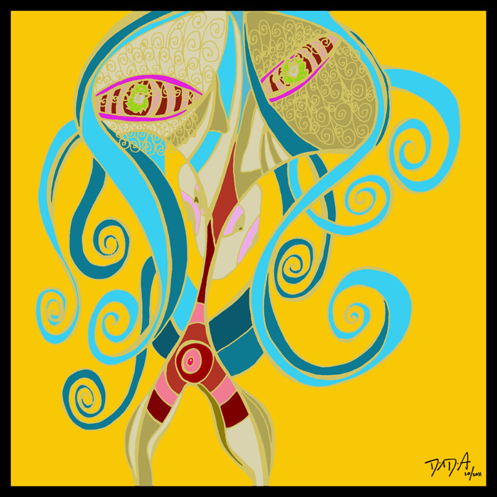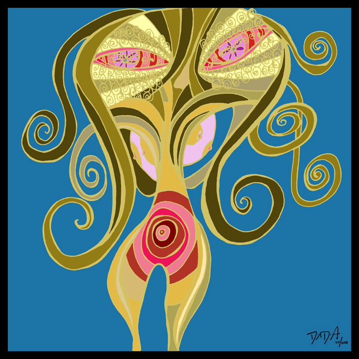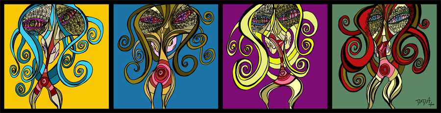 The process begins with pen, ink, & paper, and ends as a giclee; on canvas with acrylic embellishments or on lustre paper.